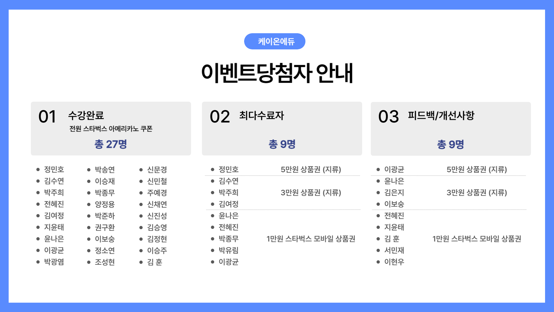 케이온에듀 이벤트 당첨자를 아래와 같이 안내드립니다.
